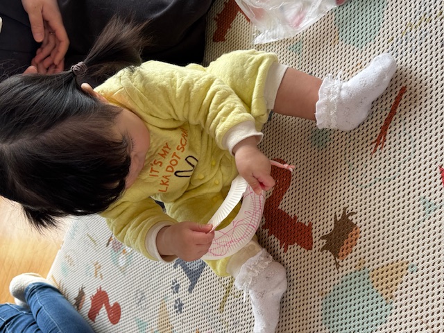 1月のよちよちクラブ 新年最初のよちよちクラブは、お正月遊びをしました。コマまわし 福笑い 風船羽子板 けん玉 お手玉をそろえてみましたが少し大きいお友達は羽子板を上手に使って風船に当てて飛ばしていましたよ。コマ回しは難しいねと話していたところに、こまどりこども園の園長先生が飛び入りでけん玉やコマ回し お手玉を披露してくださって楽しい時間になりました。 生後2か月からよちよちクラブに参加してくれている赤ちゃんが最近歩けるようになったとお母さんからのお知らせがあり今日たくさん歩いて見せてくれました。どの子もどんどん成長していく姿を見せてくれるのはとてもうれしいです。 2025-01-14