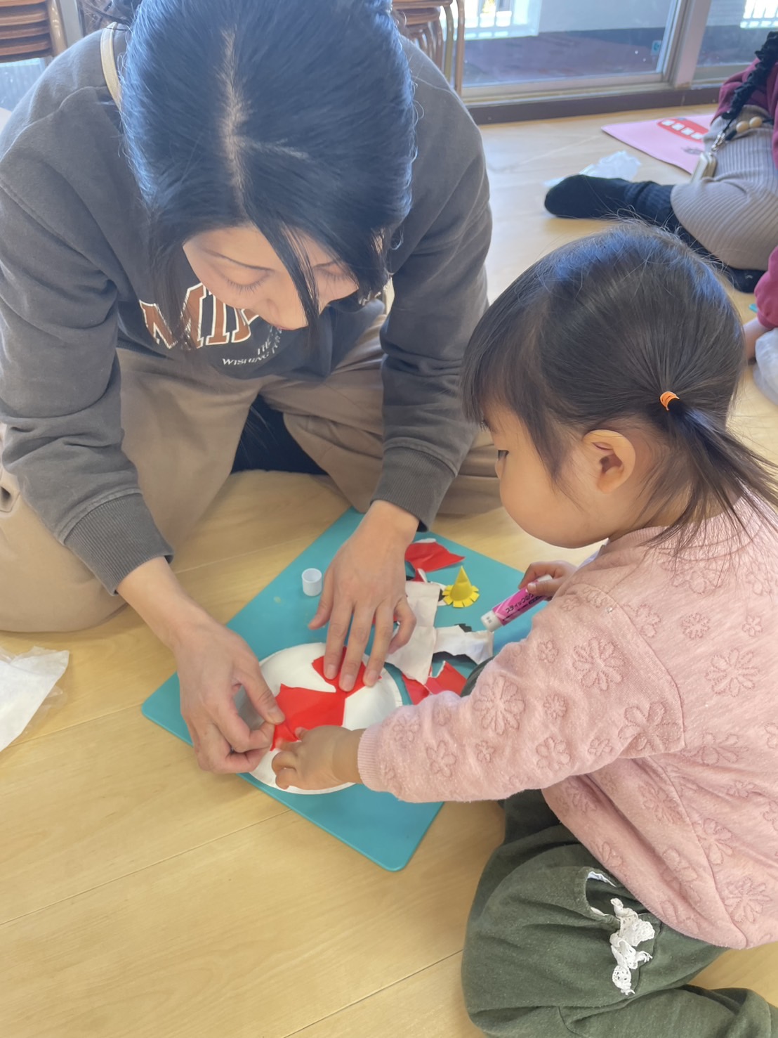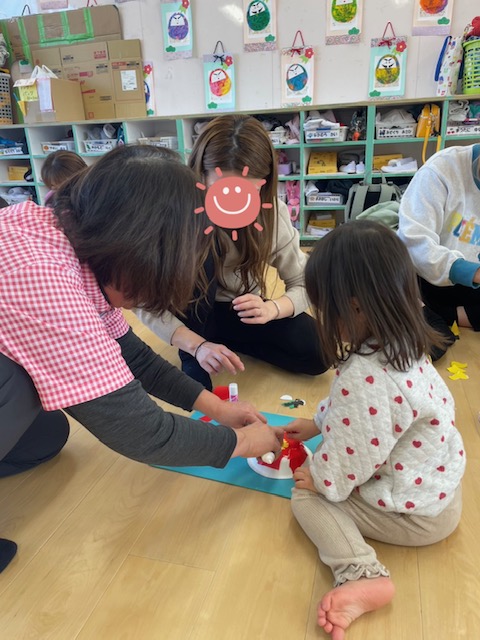 まずはじめに親子でハンドベル演奏を楽しみました。一つずつ手に持ったハンドベルを♪あわてんぼうのサンタクロース♪の曲に合わせて振ると、とてもきれいな音が鳴り子どもたちもお気に入りでしたよ。