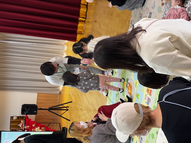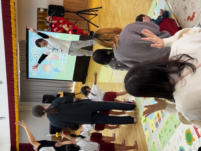 2月のゆりかごっこ2 今日のゆりかごっこは、にっこりキッズキャラバンのお兄さんたちと一緒に遊びました。大きなスクリーンで映画紙芝居をみたあとは、お兄さんたちにマンボダンスを教えてもらいゆりかごっこのお友達も一緒に踊ってみました。お兄さんたちが「マンボ!」と言いながらそばにきてくれるのがとても楽しかったようでみんなニコニコご機嫌でした。 2026-02-24